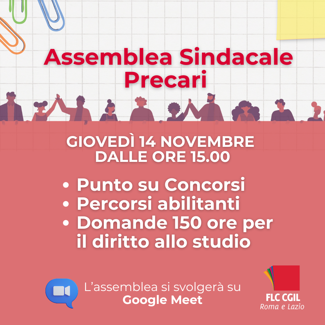 La FLC CGIL di Roma Lazio comunica che giovedì 8 febbraio dalle 16,00 alle ore 18,30 si terrà in modalità da remoto sulla Piattaforma Google Meet al seguente link https://meet.google.com/xux-psfg-xhk un’Assemblea Online dei docenti supplenti brevi e temporanei di ogni ordine e grado